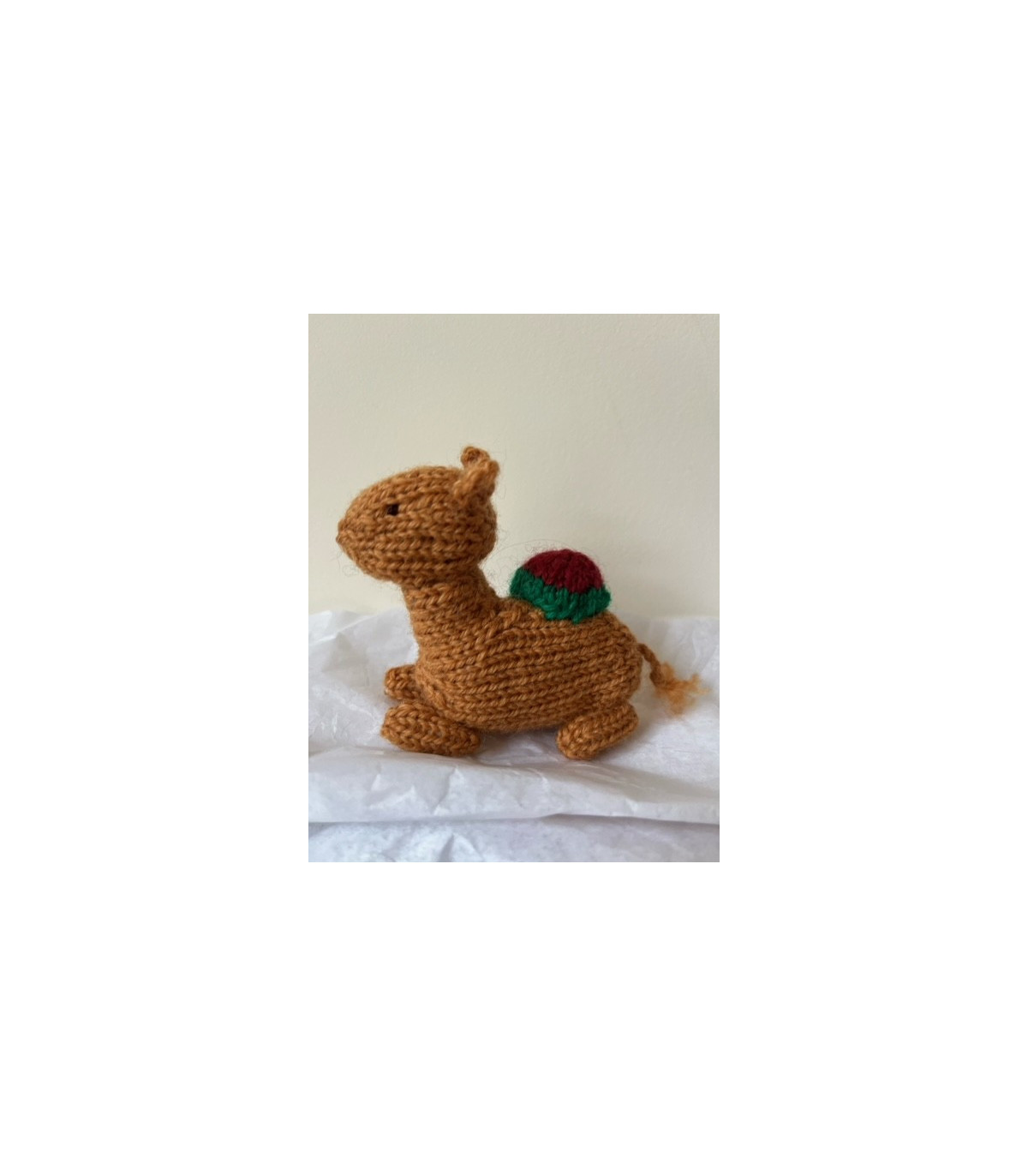 Handmade knitted and crochet camel toy with soft yarn and charming details — a cosy keepsake or gift