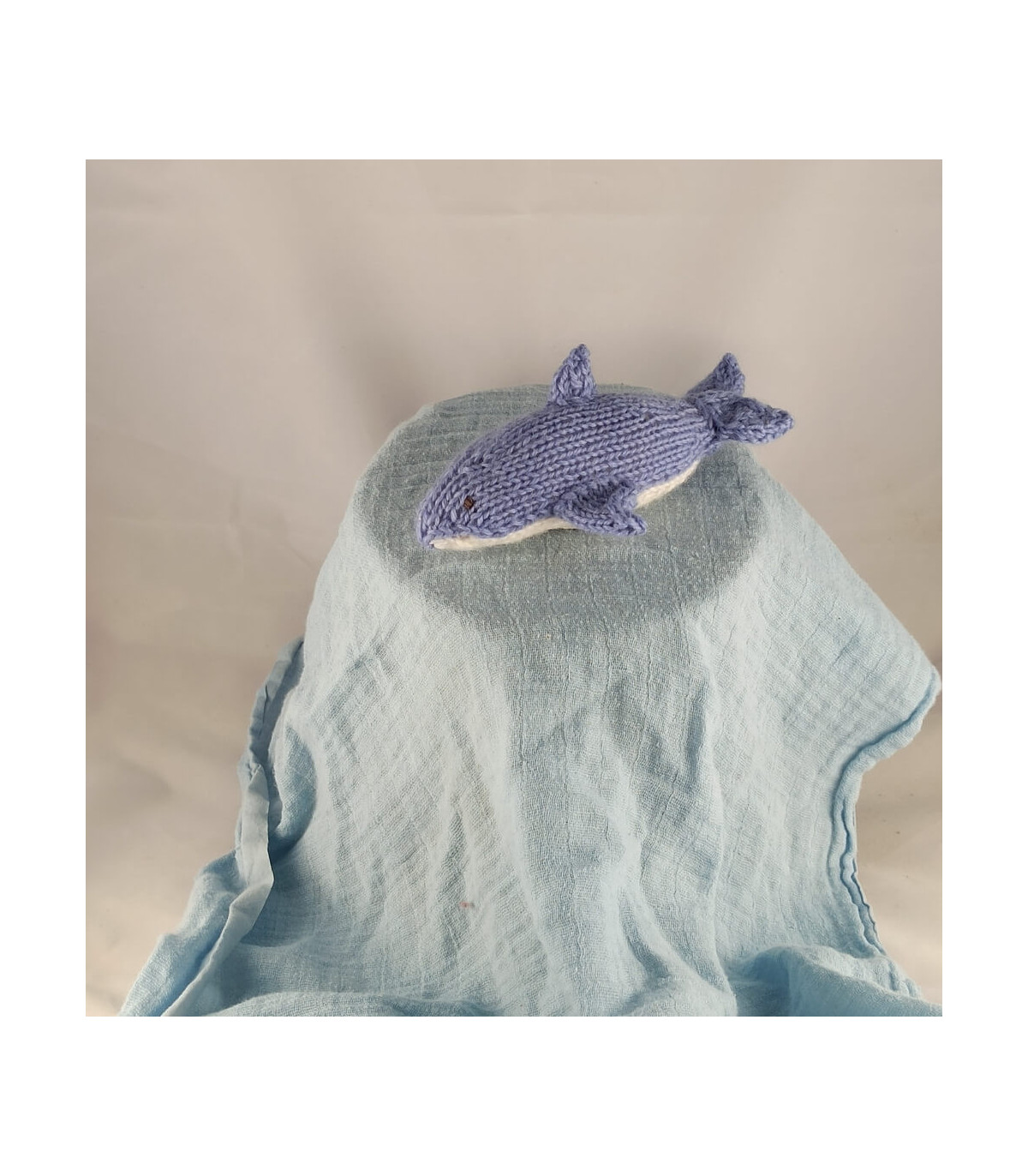 Handcrafted knitted and crocheted dolphin — soft, cuddly companion with charming seaside colours.