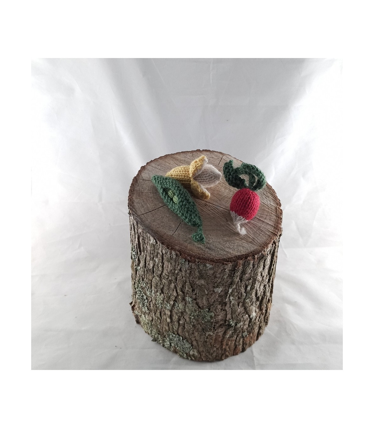Handmade large knitted and crocheted fruit and vegetables — soft, colourful toys for nurseries and home displays.