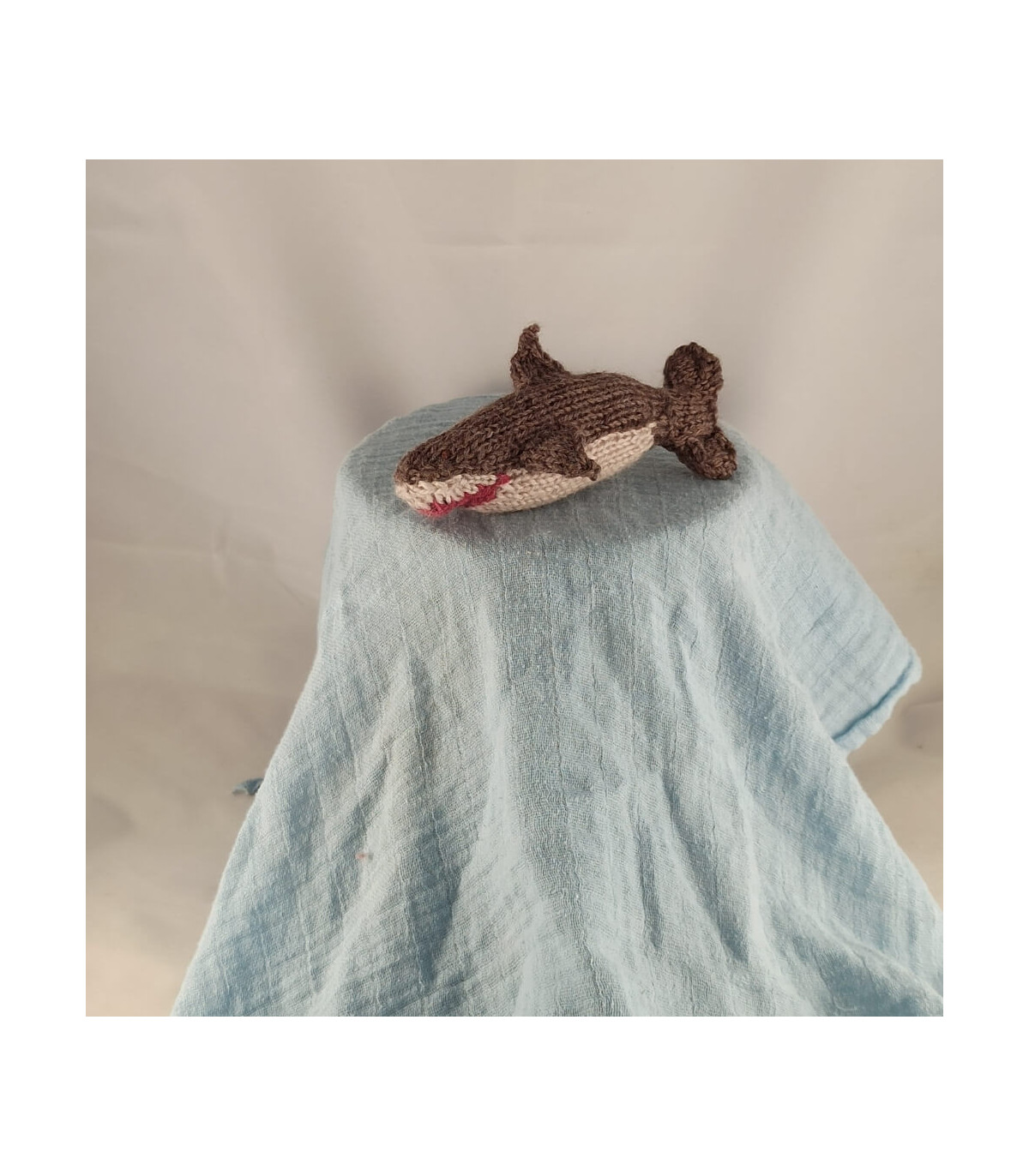 Handmade knitted or crocheted shark — soft, cuddly, full of character; the perfect gift for children and shark lovers.