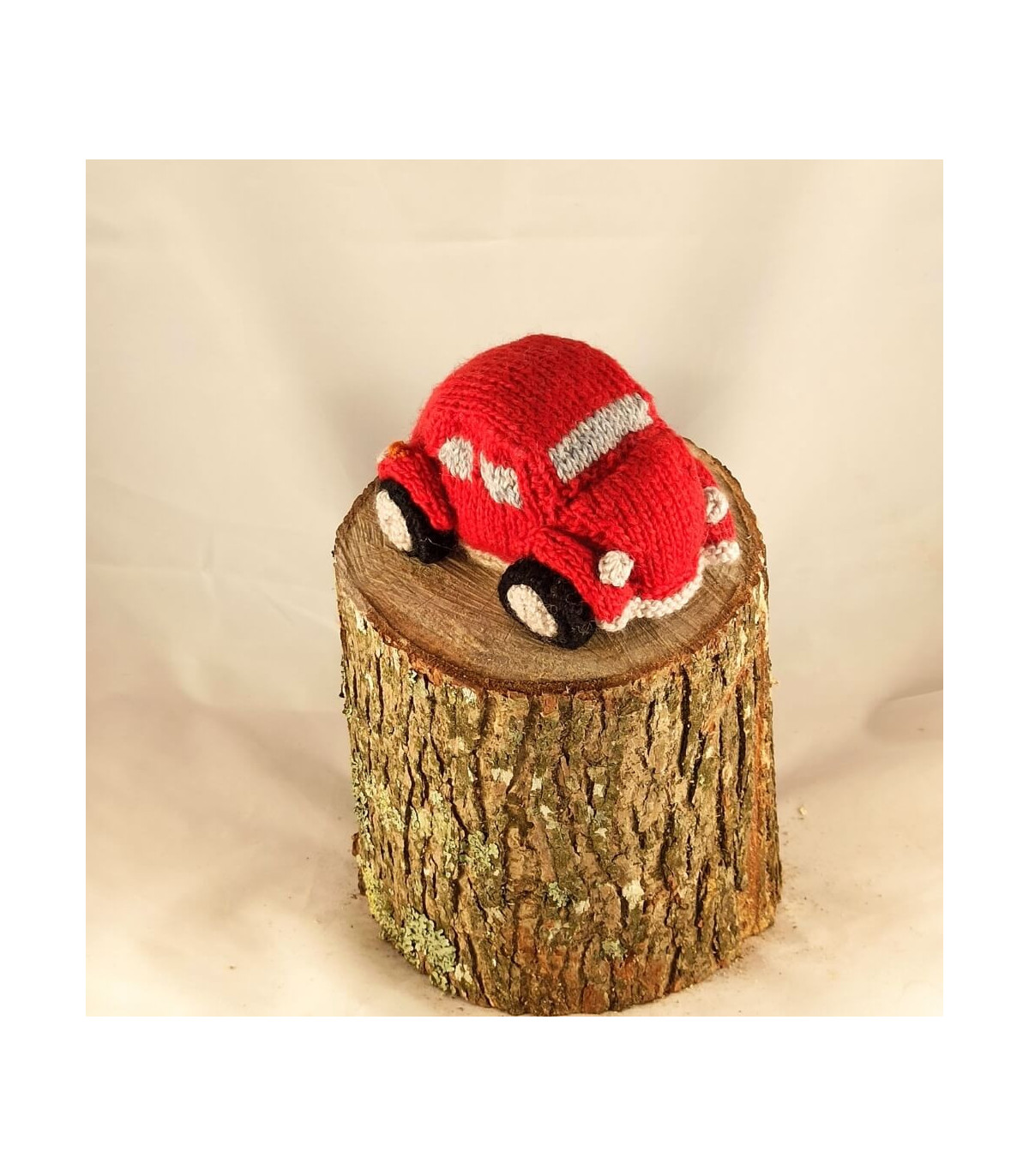 Hand-knitted or crocheted VW Beetle — charming, colourful keepsake or cuddly gift for car enthusiasts.